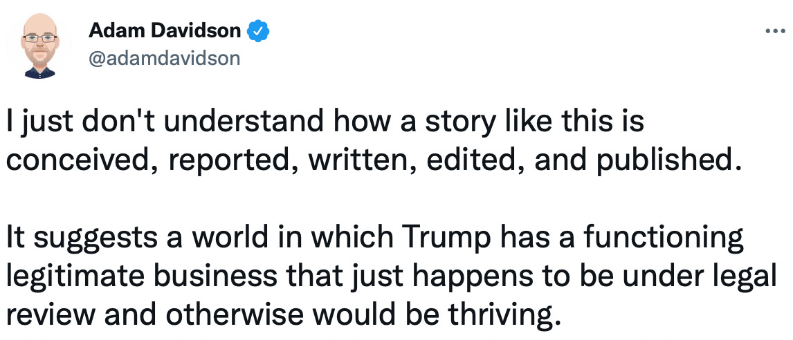 If Davidson is right about this, then the operating assumptions of the piece are all wrong, and that ultimately leads readers away from an accurate picture of things, the exact opposite aim of a publication like the Times. Think about it: If background sources are used to establish a central claim of the piece, viz., that Trump’s businesses would be doing well if not for potentially politically-motivated legal challenges, and if that’s not at all what the reality is, then the piece is actively misleading people. Worse, it is doing so in a way that has potentially serious political consequences.