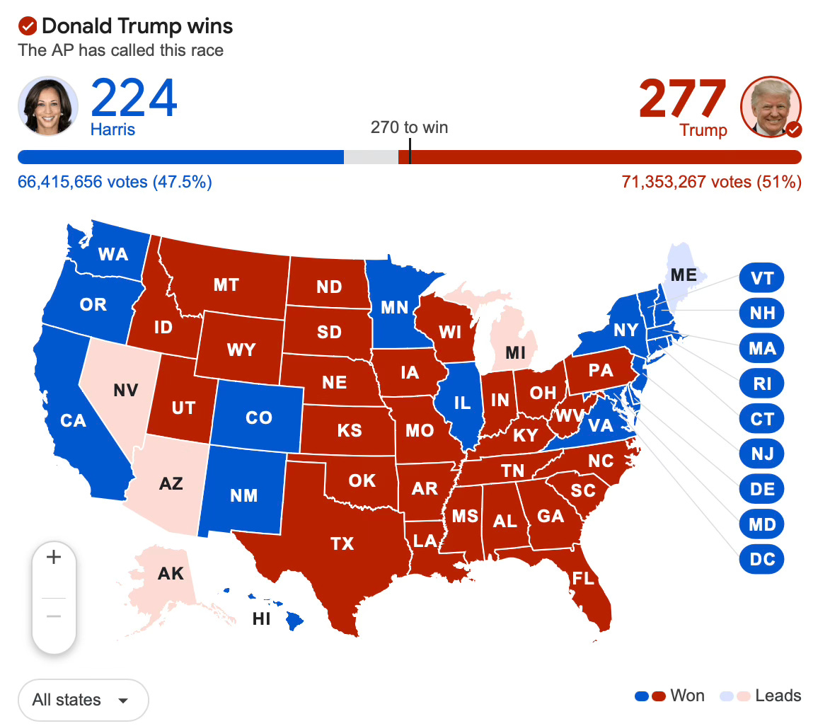 And it was his strongest showing in three elections (five if you count the 2018 and 2022 midterms). The tallying isn’t over, but Trump is on track to sweep all seven swing states, and possibly win the popular vote for the first time.