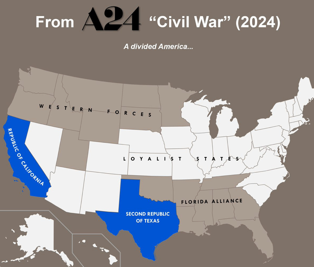 The political arrangement in Civil War is not as implausible as its detractors say. California and Texas partnering against DC defies logic if you use a 2024 partisan frame. But use a hard power frame, and the most salient condition in the movie is that the U.S. military has split.