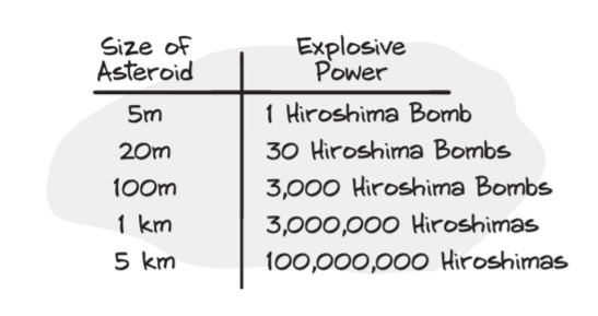 But as the rocks get bigger, they start to get more dangerous, and not even our atmosphere can stop them. To get a sense of scale, the following table compares the amount of energy that asteroids of different sizes would have with the explosive power of the bomb dropped on Hiroshima in World War II.
