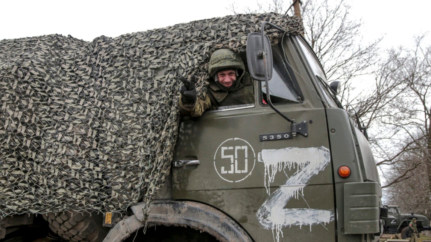 “Z” could be read as the first letter of the Russian word “za” (“for”), so “Z” could mean “for victory,” “for peace,” “for truth,” and “for the children of Donbass.” “Z” could also be the first letter in the Russian “zakanchivaem”—“we end,” and so could stand for “We end wars.” It could also be the “Z” in “de-Nazification” (though this would require using the English word) and “demilitarizatsiya,” or demilitarization. (The war is framed in Russia in terms of forcing peace upon Ukraine.)
