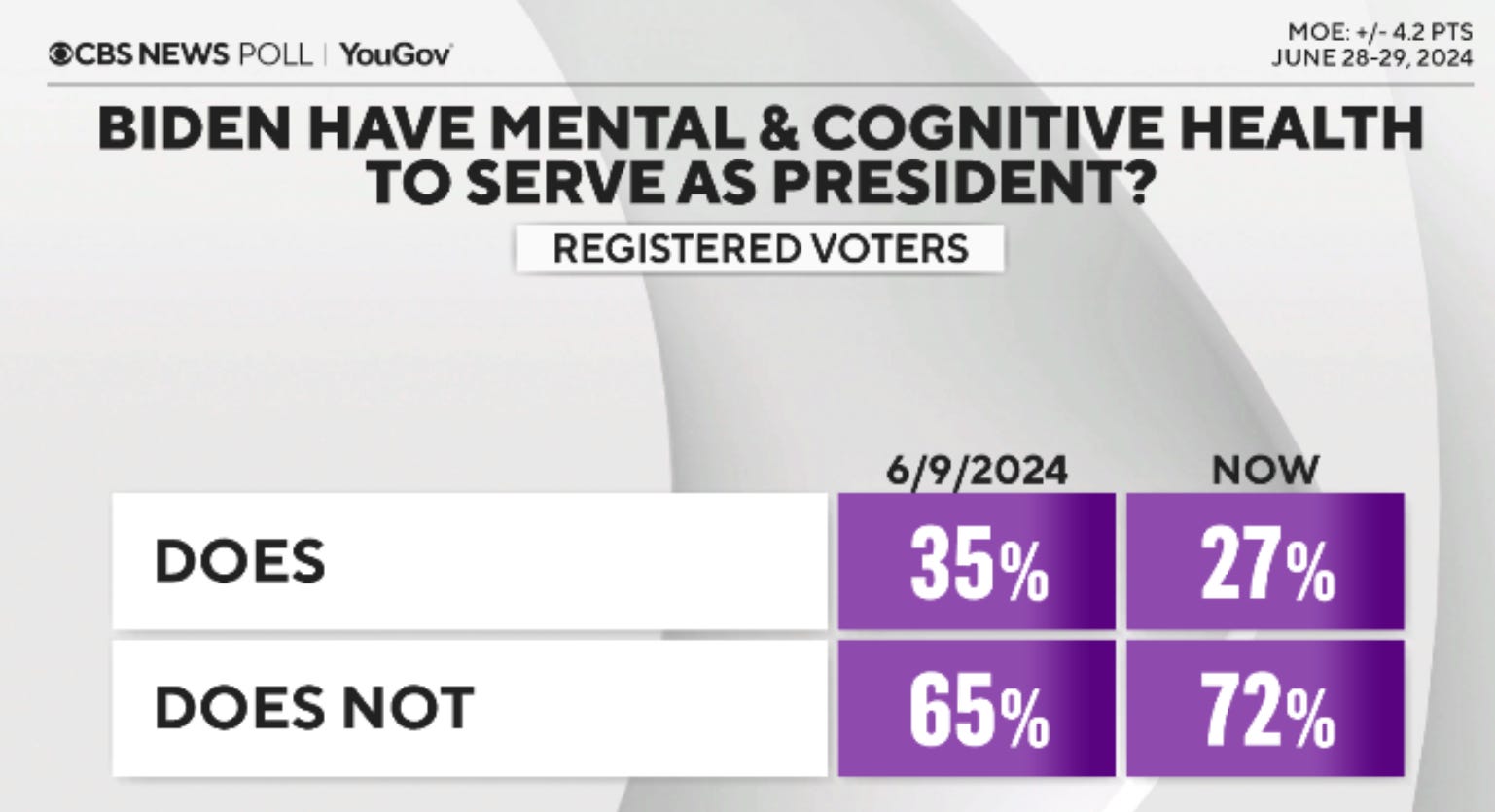 After the debate, a CBS-YouGov poll found that 72% of registered voters said Biden lacked the mental and cognitive health to serve as president, an increase of seven points from their poll a few weeks prior. 46% of registered Democrats said Biden should not be running for president, a ten point increase from pre-debate polls.