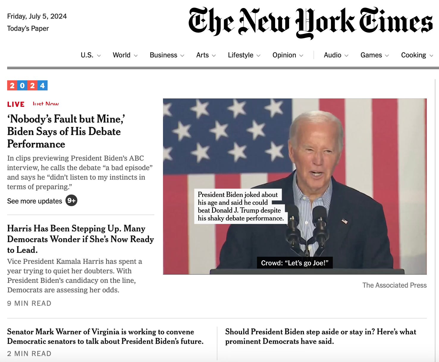 But it’s hard to see how media could hit anything harder than Biden’s age. They’ve made it one of the biggest stories all year, with banner headlines and regular updates. I’m writing this on July 5, and the New York Times’ homepage currently has four articles and a video about Biden’s age on top.