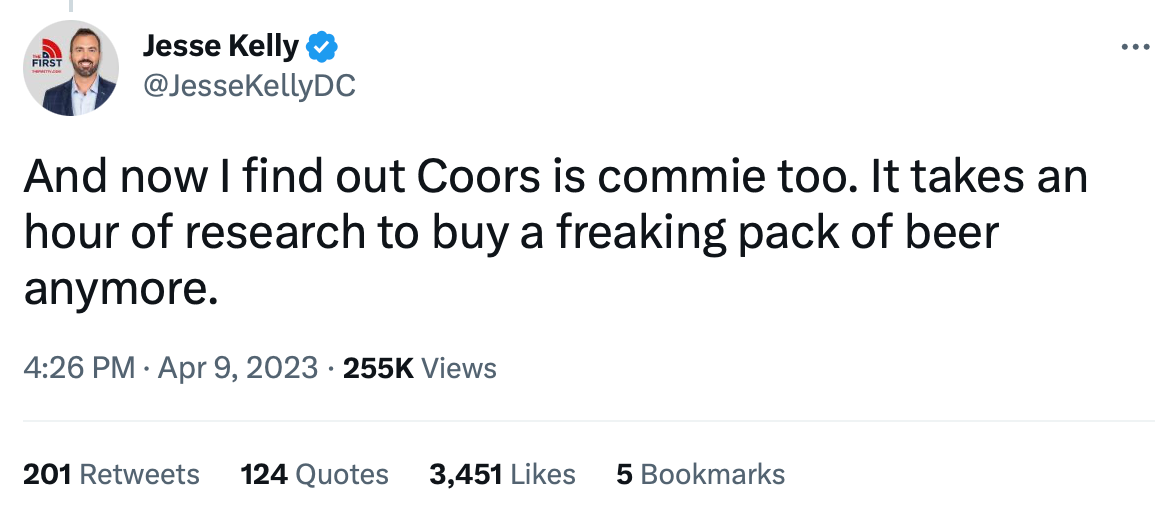 I’m not just saying this to Kelly. This is as true for the anti-Bud Light/anti-Coors sentiment on display here as it is for the anti-Chick-fil-A sentiment of yesteryear.