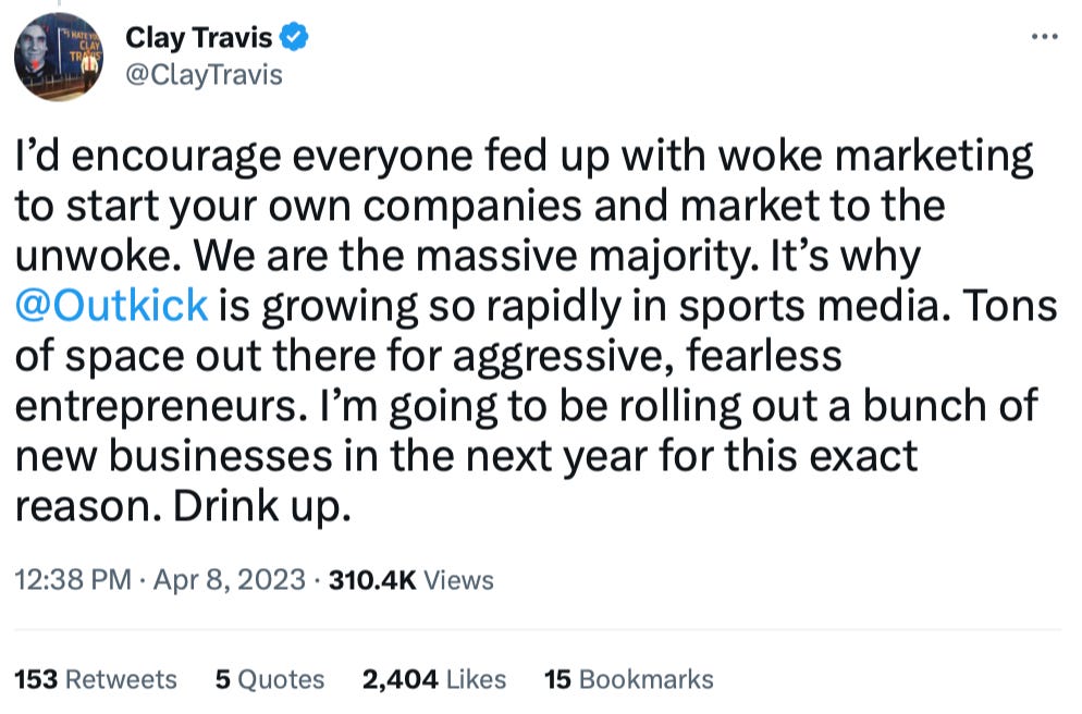 The reason there is “tons of space” for gimmick products like this is because people like Travis have discovered they can use the culture war for lucrative gains. There is no entrepreneurial interest in making a superior product; the gameplan here is monetizing anti-lib animus.
