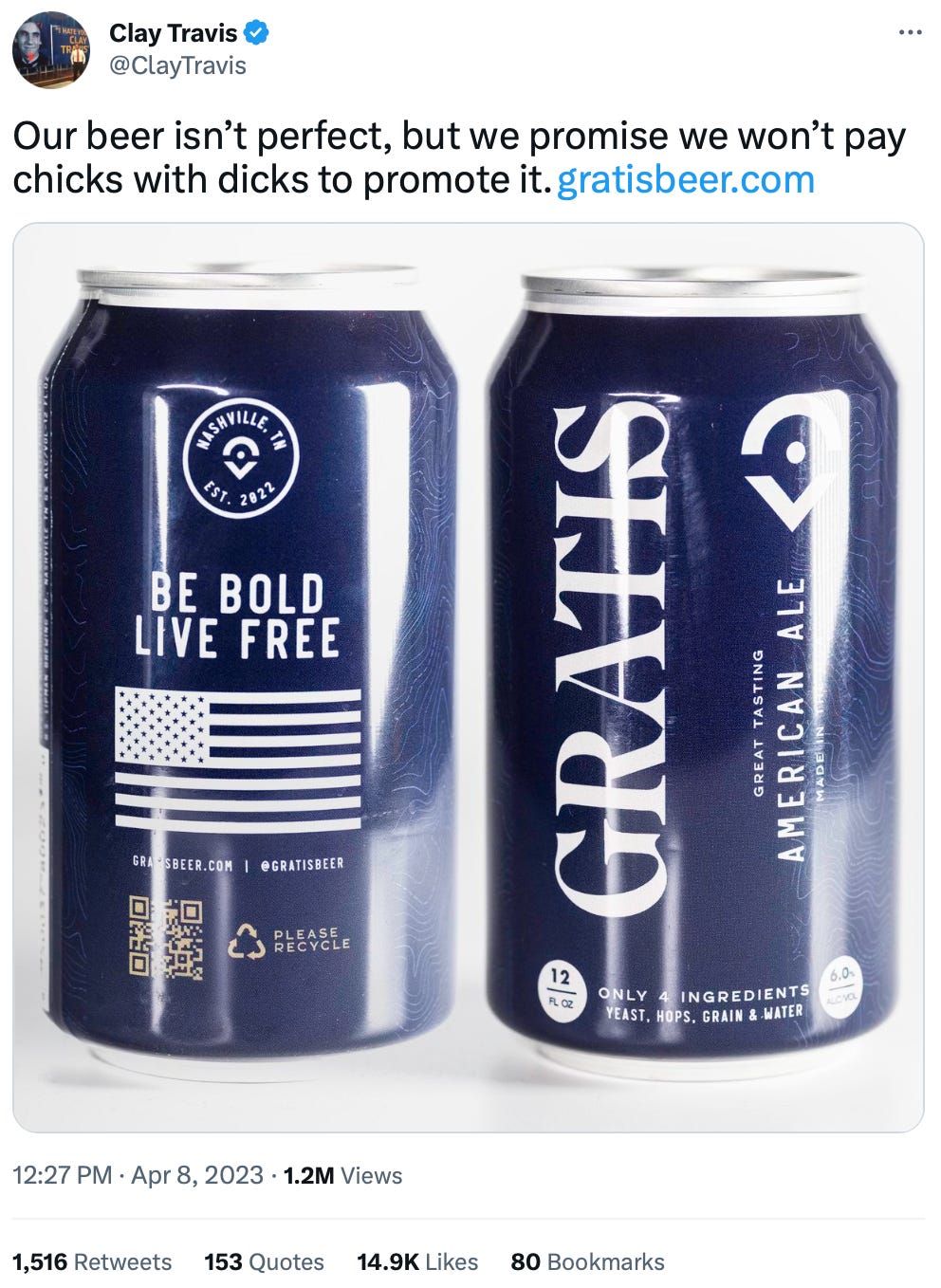 That’s the pitch for Travis’s “antiwoke” beer: “our beer isn't perfect” is an admission of inferior quality, or at the very least a tacit acknowledgment that quality isn’t what ought to be driving your purchasing decisions. Instead, Gratis’s supposed value-add is that it won’t be marketed to communities at odds with MAGAism.