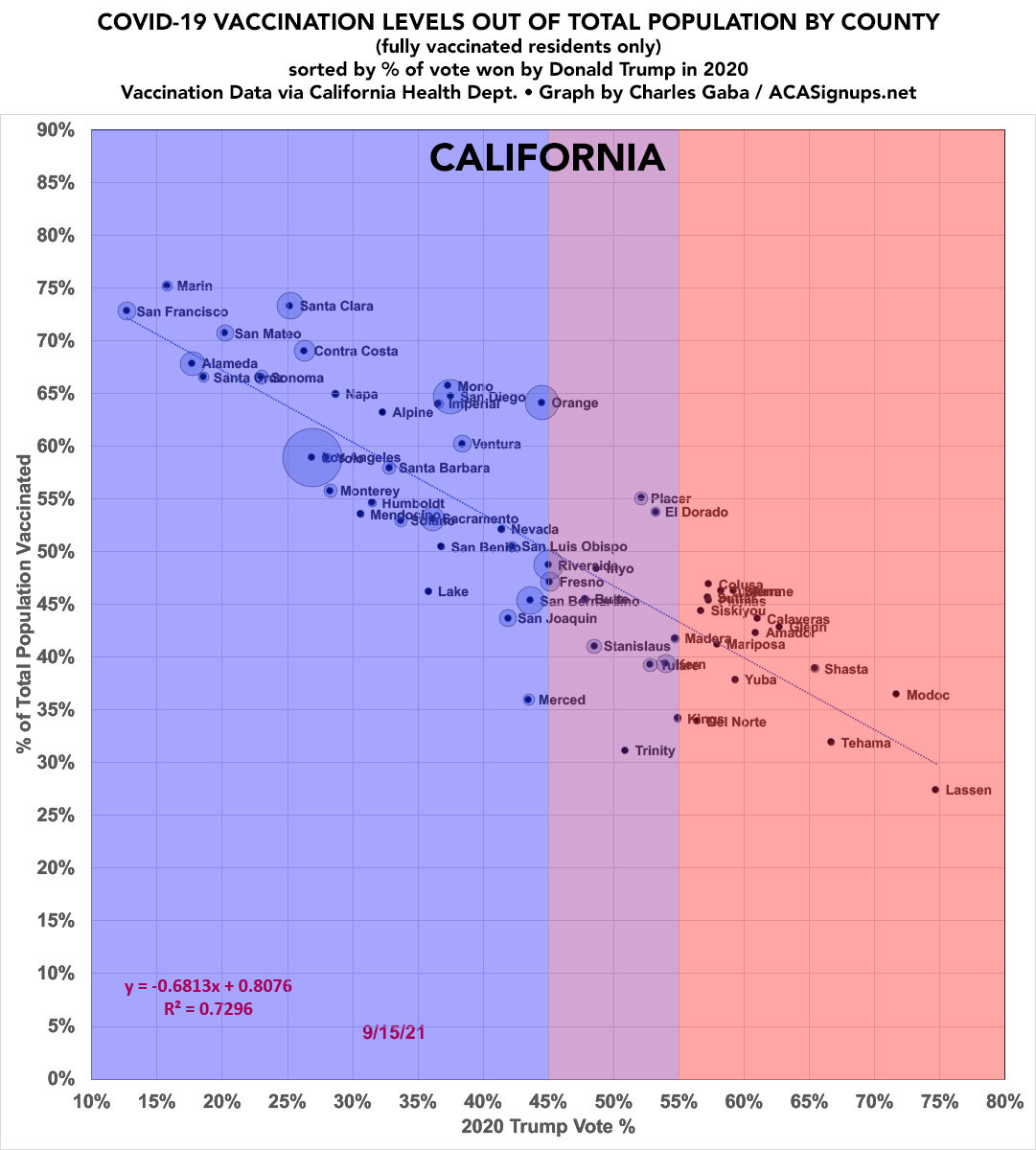 As healthcare data analyst Charles Gaba shows, vaccination rate in the United States correlates with 2020 Trump vote down to the county level. That pattern holds in California, as well as other states. The more a county voted for Trump, the less vaccinated it is.