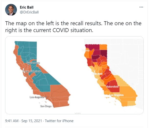 On the left is the recall vote, with the blue-colored counties voting yes (i.e., to remove Newsom) and the red-colored counties voting to keep the governor in office. On the right is current COVID case counts per 100,000 residents, with darker colors indicating more. The maps aren’t identical, but the overlap is evident.