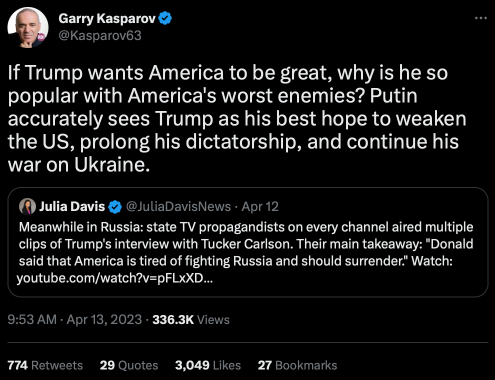What makes him a loser is that he thought the benefits of impressing a bunch of teenagers outweighed the potential costs. Tom Nichols makes a very good point: The thing that unites Teixeira with other famous recent leakers—Chelsea Manning, Edward Snowden, and the ironically named Reality Winner—is narcissism. They all thought their narrow needs and ambitions were more important than the damage they were doing. You might argue that the other “whistleblowers” had loftier rationales for what they did, but they still thought that they were uniquely qualified to make judgements that harmed the country and real human beings.
