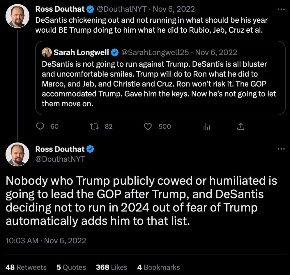 Ross Douthat’s new column in The New York Times is about Ron DeSantis—specifically, that if he truly wants to be president, then this is his time to run. Douthat previously made this case on Twitter, and I remember thinking that his reasoning was entirely correct.