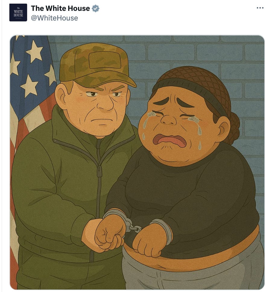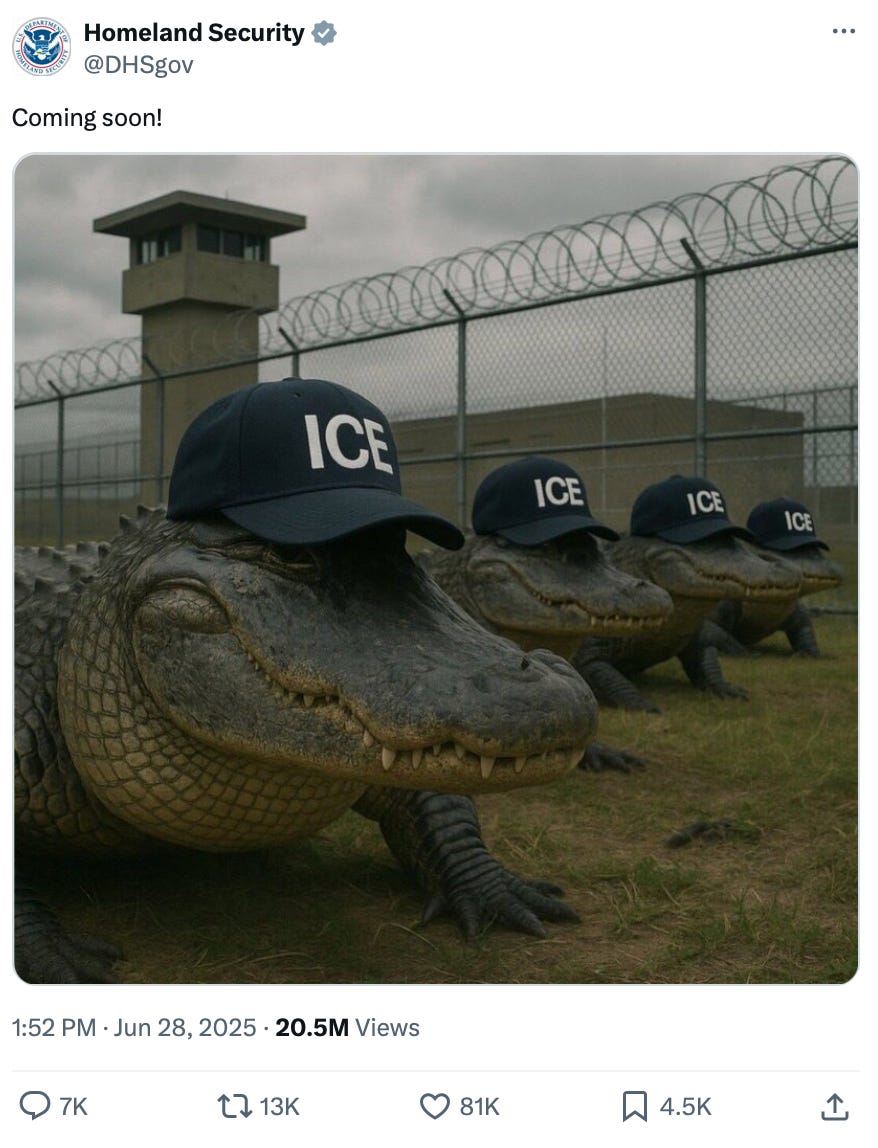 The Trump White House and Department of Homeland Security regularly broadcast a mix of references to white supremacist literature and cutesy AI imagery celebrating rights violations and cruelty, much of which they find in the internet’s far right fever swamps. For example, DHS advertised the concentration camp nicknamed “Alligator Alcatraz”—detainees include hundreds of people who have no criminal charges—with a fake image of prison-guarding gators wearing ICE hats.