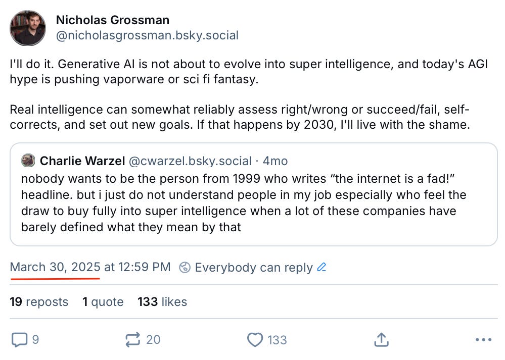 Maybe they’re right and I’m wrong, we’ll see. I’m not claiming humanity will never create AGI, or never reach the hypothesized Singularity, when advanced AGI can create even more advanced AGI, taking technology beyond human comprehension. Who knows. But I bet that, if we actually reach it, it’ll take another leap on par with LLMs, perhaps multiple leaps, and will not happen in the next three years. If that seems like a safe prediction to you, note that more influential people than I — tech CEOs, New York Times writers, senior government officials — claim AGI is imminent.
