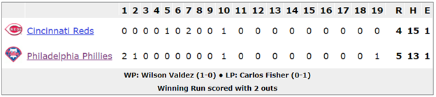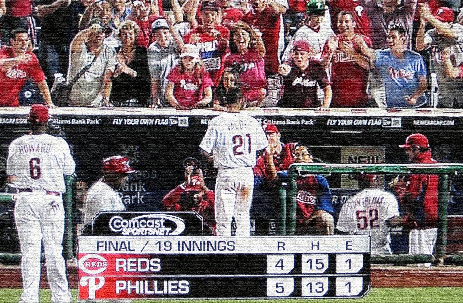 Most starters get four, maybe five turns at the plate in a baseball game. Yet this night multiple Reds and Phillies had twice that many. There are two possible explanations. One is that both teams put up so much offense players kept getting chances to hit. A final score of 5-4 Phillies rules that theory out. The other explanation is that players kept batting because the game kept going. And going. And going.