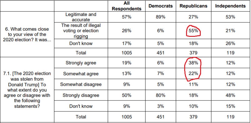 Polls, such as this one from Reuters/Ipsos in April, show a majority of Republicans believe Trump’s lies about a stolen election.